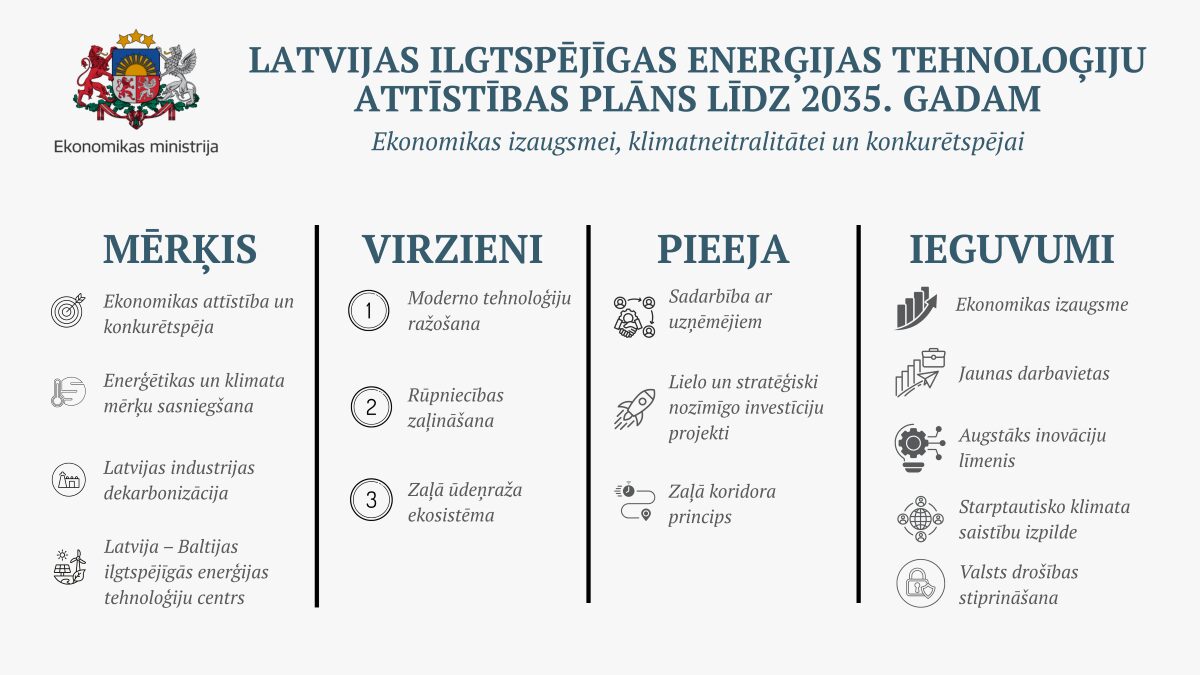 Šī gada 20. janvāra Ministru kabineta (MK) sēdē apstiprināts Ekonomikas ministrijas (EM) plāna projekts Latvijas ilgtspējīgas enerģijas tehnoloģiju attīstības plāns līdz 2035. gadam, kura nolūks ir noteikt  nepieciešamos rīcības virzienus un prioritāros pasākumus valsts ekonomiskās attīstības veicināšanai, ceļot Latvijas industrijas iespējas izmantot neto nulles emisiju tehnoloģijas ražošanas attīstībai, ziņo Ekonomikas ministrijas pārstāvji.