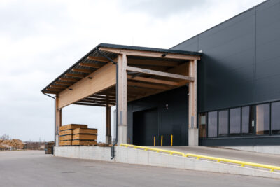 Jaunajā ražošanas ēkā atrodas arī divi speciāli izbūvēti biroja telpu bloki ‒ viens iekštelpās, kur atrodas birojs, laboratorija un atpūtas telpas, otrs ‒ ārpusē pie gatavās produkcijas nojumes. Jāpiemin, ka arī pašu ražotais bērza saplāksnis ir izmantots jaunajās telpās. Saplākšņa mēbeles ir birojā, laboratorijā un atpūtas telpās. Rūpnīcā un tās teritorijā uzstādītas arī saplākšņa ceļa zīmes un norādes. Saplāksnis pielietojumu radis arī kā palīgmateriāls betonēšanas veidņos un citur.