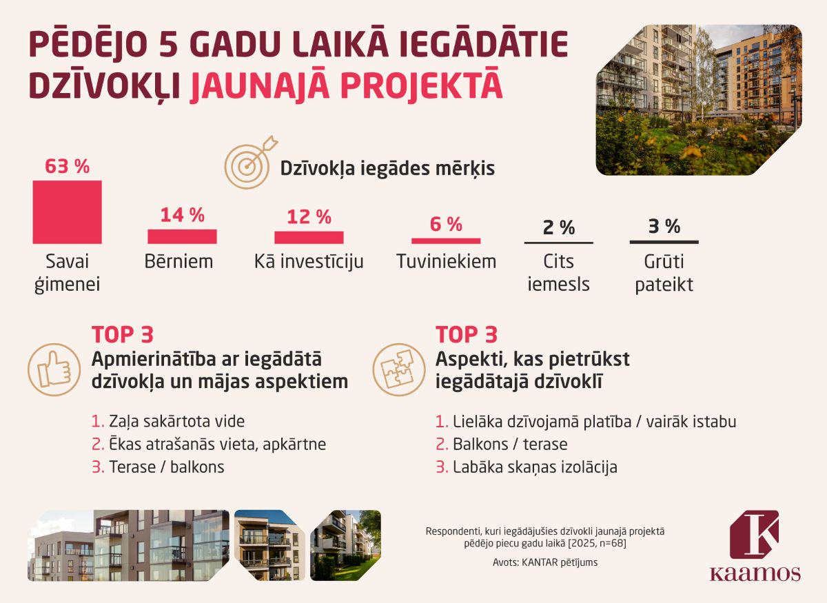 Kā atklāj Kantar pētījuma dati, lielākā daļa jeb 63% aptaujāto dzīvokli jaunajā projektā iegādājušies ģimenes vajadzībām, savukārt aptuveni piektā daļa to pirkuši saviem bērniem vai tuviniekiem, liecinot par pieaugušu tendenci salīdzinājumā ar 2024. gadu. Kā investīciju mājokli jaunā ēkā iegādājušies 12% respondentu.