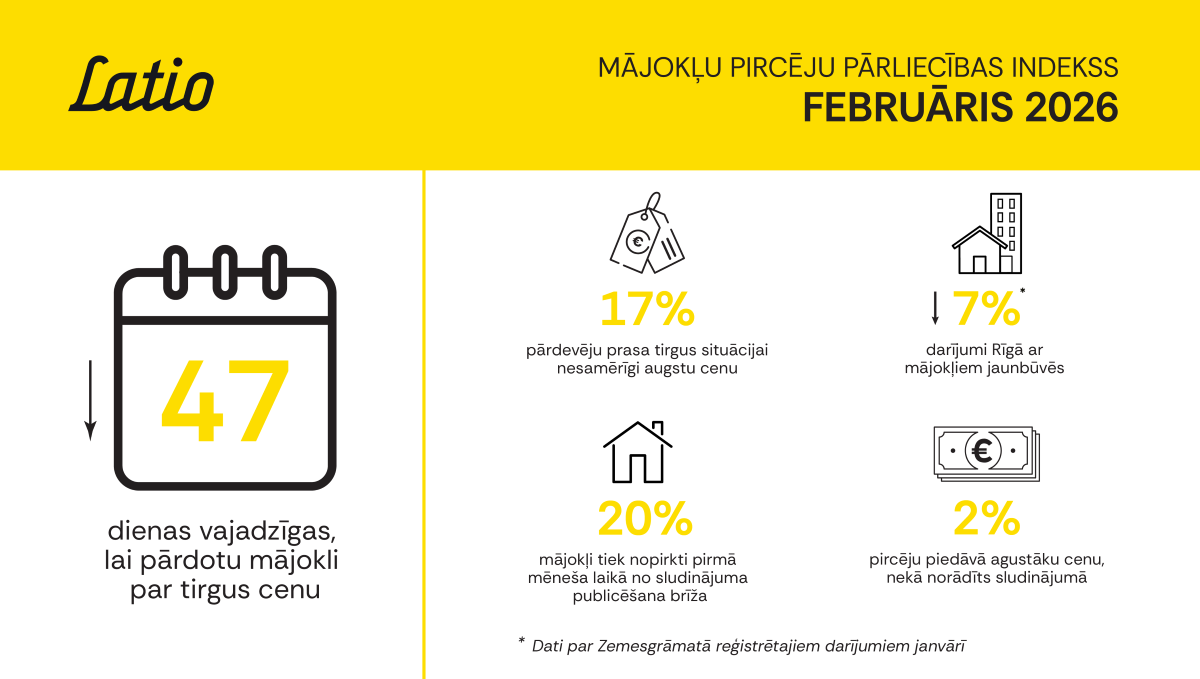 *Lai iedzīvotāji būtu labāk informēti par aktuālo situāciju nekustamā īpašuma tirgū, “Latio” ik mēnesi publicē “Mājokļu pircēju pārliecības indeksu”, apkopojot sešus visizteiksmīgāk raksturojošos situācijas rādītājus tirgū aizvadītajā mēnesī.