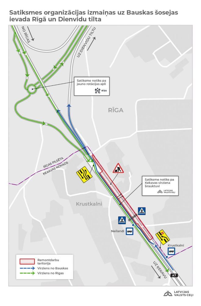 Pie Bauskas šosejas (A7) ievada Rīgā turpinās gājēju un velosipēdistu infrastruktūras būvdarbi, kurus organizē VSIA Latvijas Valsts ceļi (LVC), kā arī Dienvidu tilta 4. kārtas izbūve, ko organizē Rīgas pašvaldība. Tuneļa būvdarbi zem Bauskas šosejas ievada Ķekavas virziena brauktuves ir pabeigti tādā apjomā, lai varētu pārslēgt satiksmi tuneļa zonā no kreisās brauktuves uz labo brauktuvi, un būvnieki turpinās darbus zem Rīgas virziena brauktuves, ar ko saistītas izmaiņas satiksmes organizācijā, ziņo LVC pārstāvji.