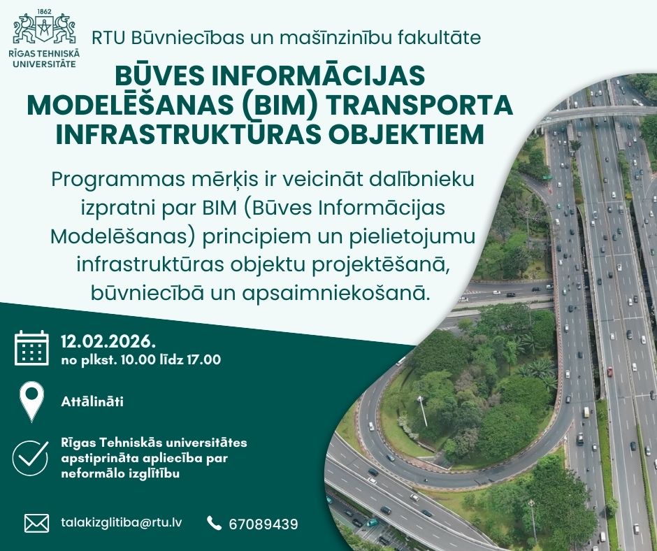Rīgas Tehniskās universitātes (RTU) Būvniecības inženierzinātņu institūts piedāvā kursu Būves Informācijas Modelēšanas (BIM) transporta infrastruktūras objektiem.
