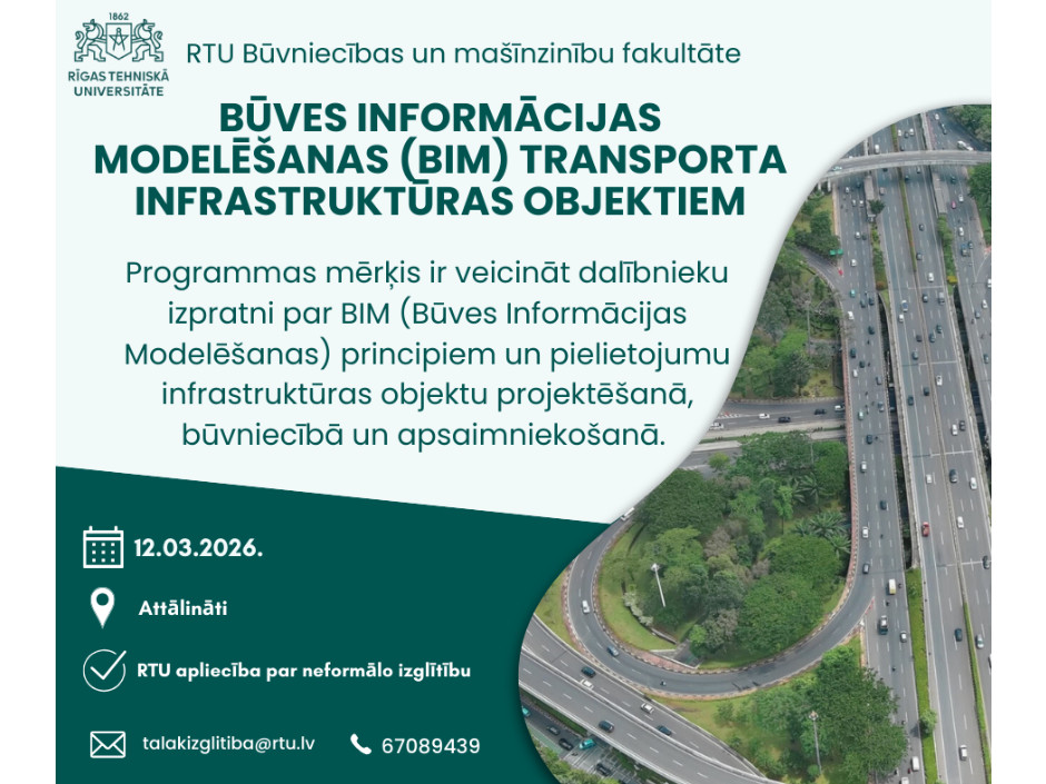 Rīgas Tehniskās universitātes (RTU) Būvniecības inženierzinātņu institūts piedāvā kursu Būves informācijas modelēšana (BIM) transporta infrastruktūras objektiem.