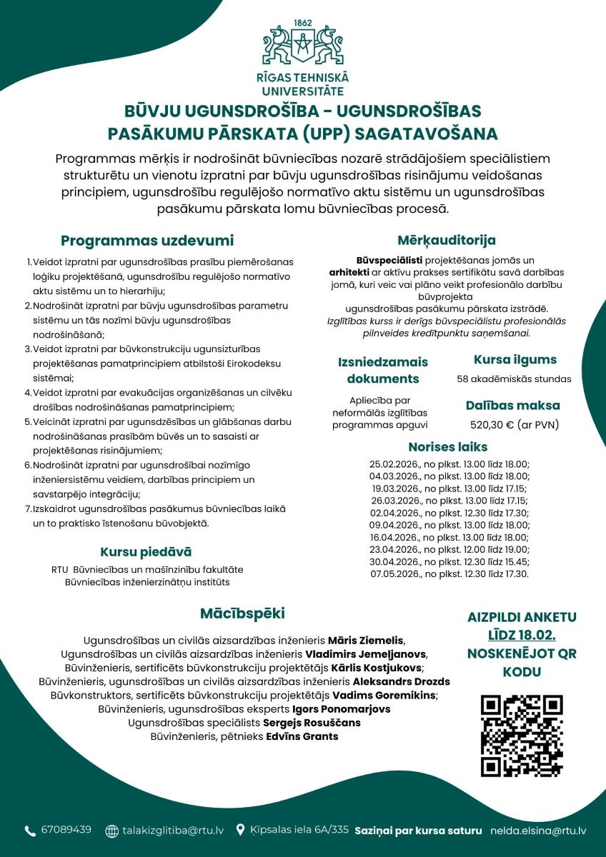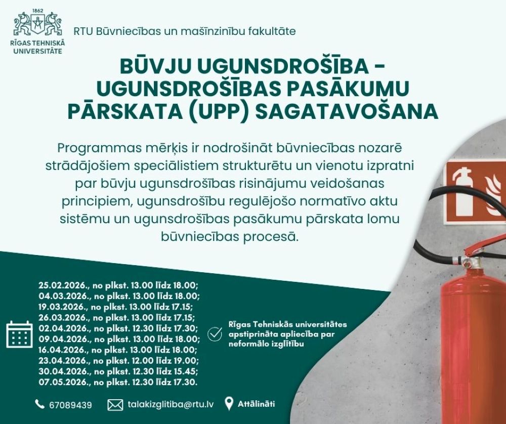 Rīgas Tehniskās universitātes (RTU) Būvniecības inženierzinātņu institūts piedāvā kursu Būvju ugunsdrošība – ugunsdrošības pasākumu pārskata (UPP) sagatavošana.