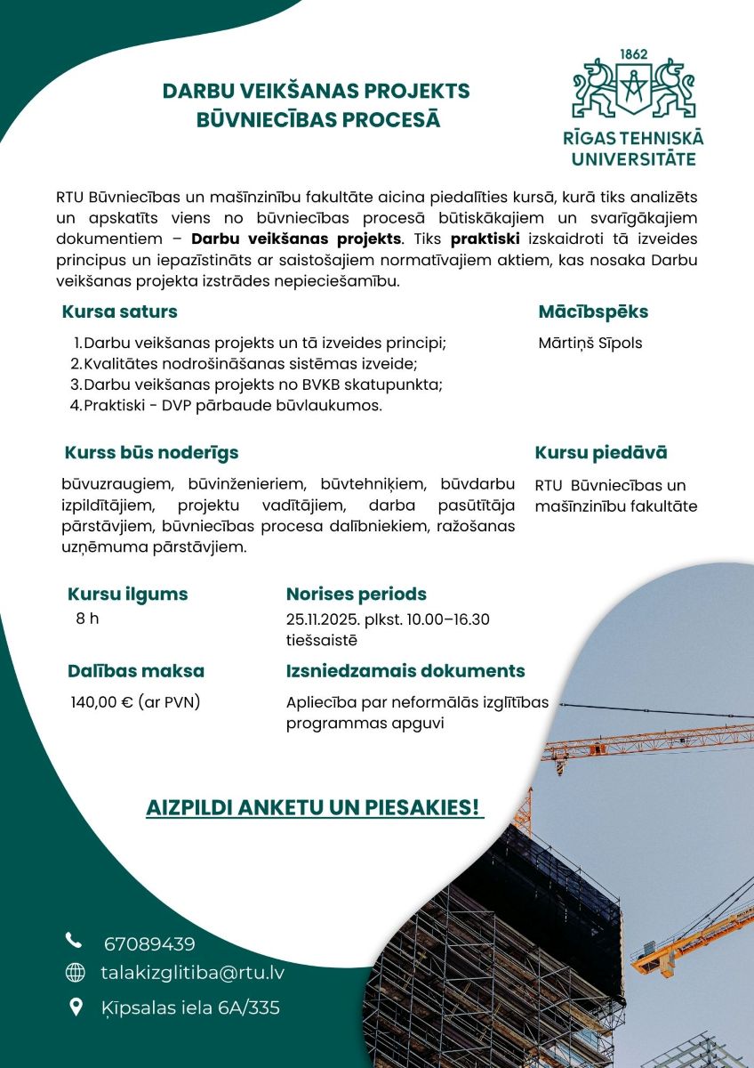 Rīgas Tehniskās universitētes (RTU) Būvniecības inženierzinātņu institūts piedāvā kursu Darbu veikšanas projekts būvniecības procesā.