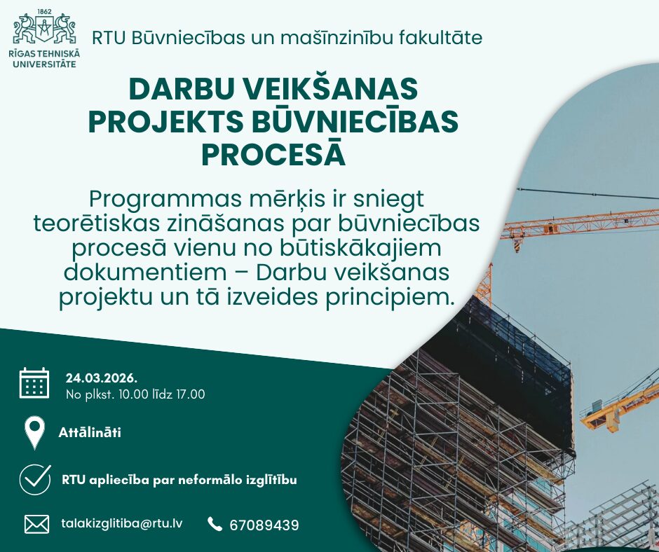 Rīgas Tehniskās universitātes (RTU) Būvniecības inženierzinātņu institūts piedāvā kursu Darbu veikšanas projekts būvniecības procesā.