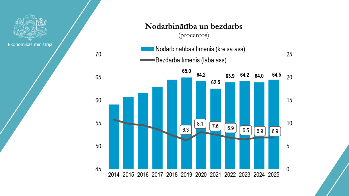 Darba tirgus joprojām saskaras ar vairākiem strukturāliem izaicinājumiem. Saglabājas augsts ilgstošo bezdarbnieku īpatsvars – aptuveni 1/3 bezdarbnieku darba meklējumos bija ilgāk par 12 mēnešiem. Darbaspēka piedāvājumu vienlaikus ierobežo prasmju neatbilstība un izteikta reģionālā nesabalansētība, kā arī nelabvēlīgās demogrāfiskās tendences – 2025. gadā iedzīvotāju skaits vecumā no 15–74 gadiem samazinājās par 12,5 tūkstošiem salīdzinājumā ar 2024. gadu.