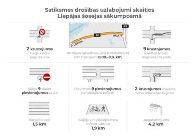 Lai uzlabotu satiksmes drošību un mazinātu potenciālo konfliktpunktu skaitu, šogad plānots pilnveidot Liepājas šosejas (A9) sākumposmu no Rīgas apvedceļa (A5) (Brīvkalniem) līdz Trenčiem (0,00.–9,9. km), ziņo VSIA Latvijas Valsts ceļi (LVC) pārstāvji.