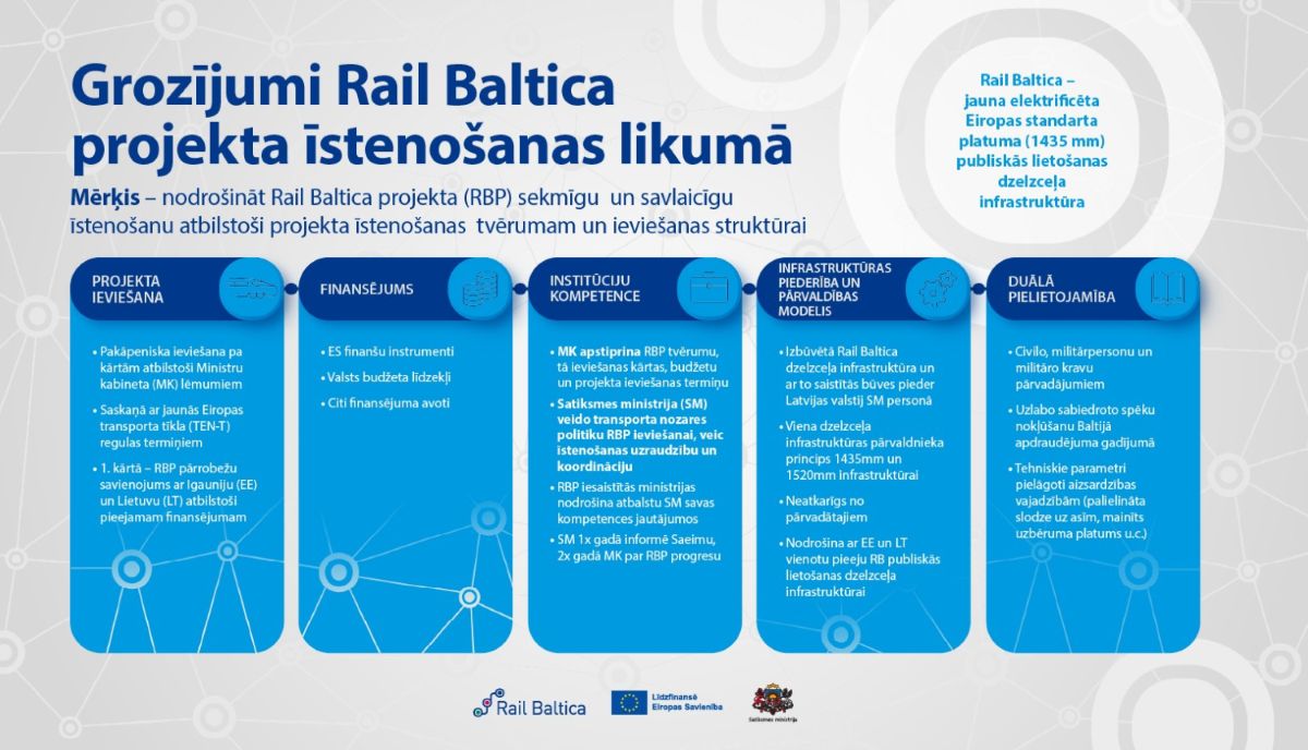 Kā iepriekš ziņots, lai veicinātu Rail Baltica projekta īstenošanu, tika izstrādāts Rail Baltica projekta īstenošanas likums, kas stājās spēkā 2022. gada 14. novembrī. Pašreizējā redakcijā likums ietver normas, kas regulē dažādus ar projekta ieviešanu saistītus jautājumus.