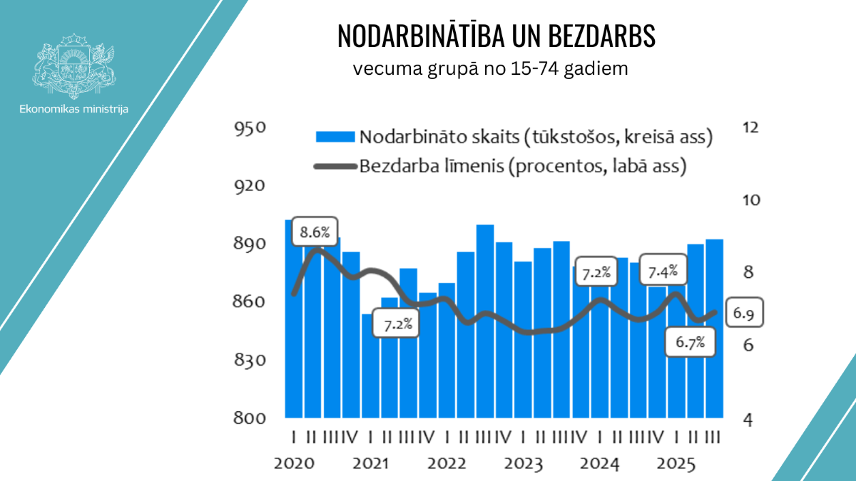 Bezdarba līmenis 2025. gada 3. ceturksnī palielinājās līdz 6,9 %, kas ir par 0,2 procentpunktiem augstāks rādītājs nekā 2025. gada 2. ceturksnī (6,7 %) un par 0.2 procentpunktiem augstāks nekā 2024. gada 3. ceturksnī ( 6,7 %). Tajā pašā laikā bezdarba līmenis joprojām saglabājas par 0,5 procentpunktiem zemāks nekā 2025. gada 1. ceturksnī (7,4%). Kopumā bezdarbnieku skaits sasniedza 66,2 tūkstošus iedzīvotāju vecumā no 15-74 gadiem, kas ir par 2,5 tūkstošiem vairāk nekā ceturksni iepriekš. Nelielais bezdarba pieaugums 2025. gada 3. ceturksnī galvenokārt skaidrojams ar iedzīvotāju ekonomiskās aktivitātes kāpumu un kopējā darbaspēka piedāvājuma pieaugumu darba tirgū.