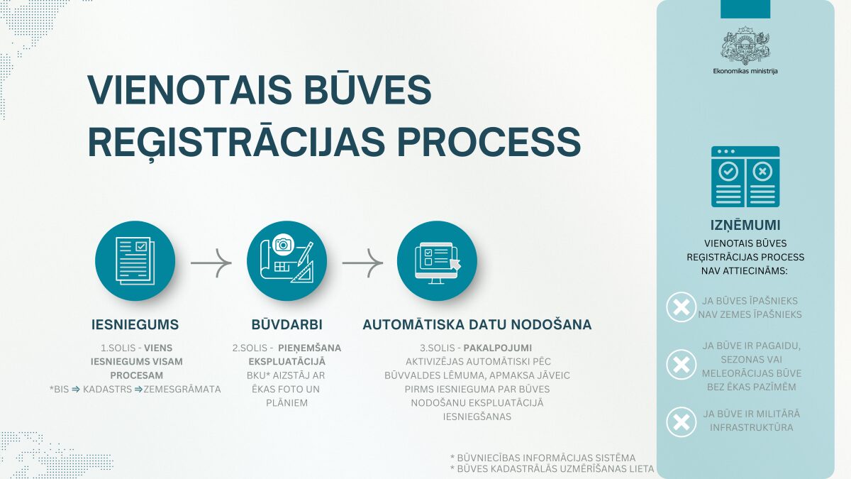 Vienotais būves reģistrācijas process ir pēdējo gadu būtiskākā reforma būvniecībā. Kopš 2020.gada ir uzsākta, bet nav pabeigta vairāk nekā 32 tūkstošu dažādu jaunu ēku būvniecība. Ņemot vērā, ka vairumā gadījumu būvniecības ierosinātājs ir arī zemes vienības īpašnieks, šajās lietās būs iespējams piemērot vienoto būves reģistrācijas procesu.