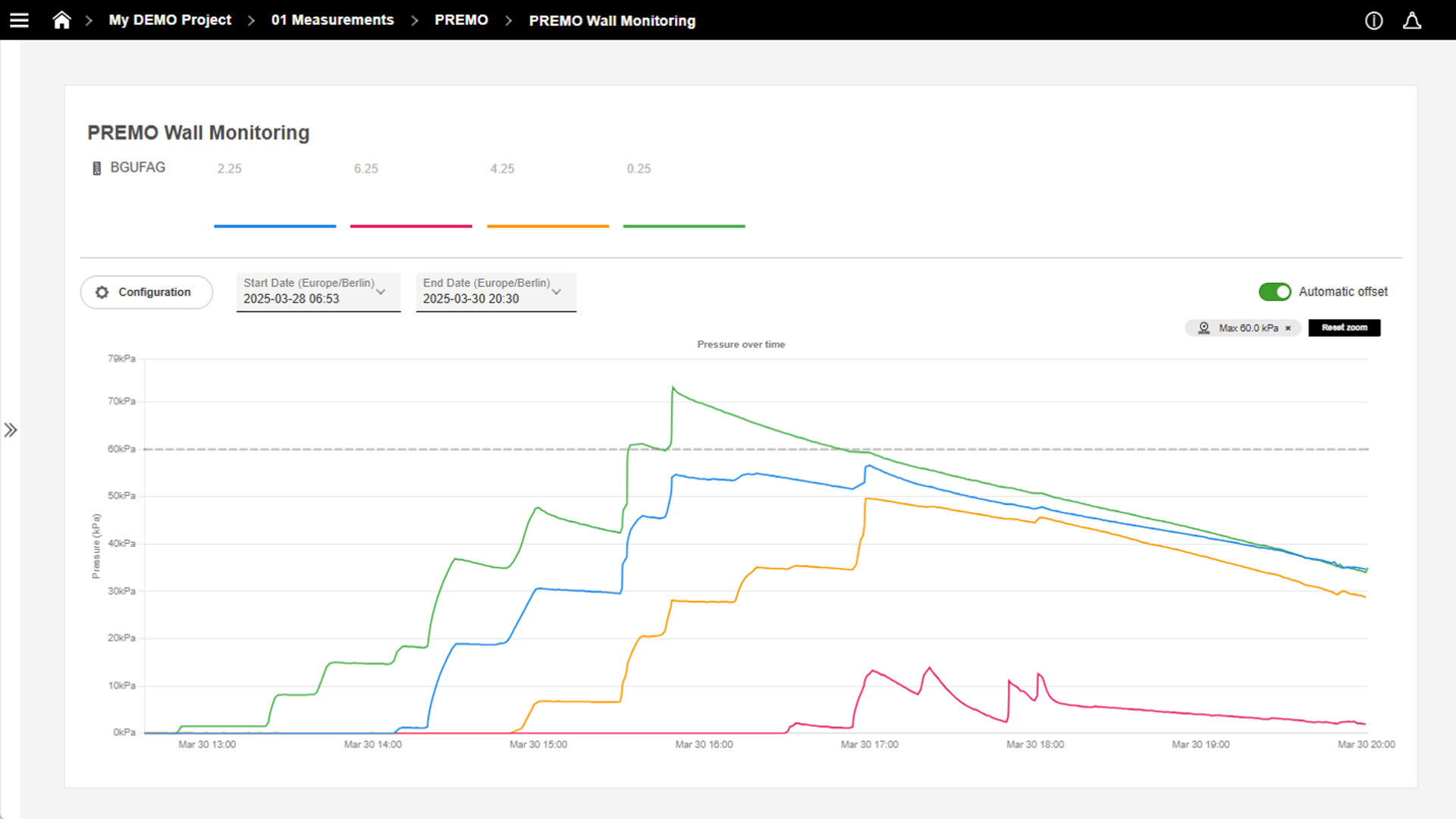 Attēls 1 Vemaventuri tīmekļa lietotnes ekrānuzņēmums ar betona spiediena līknēm, kas mērītas ar PREMO