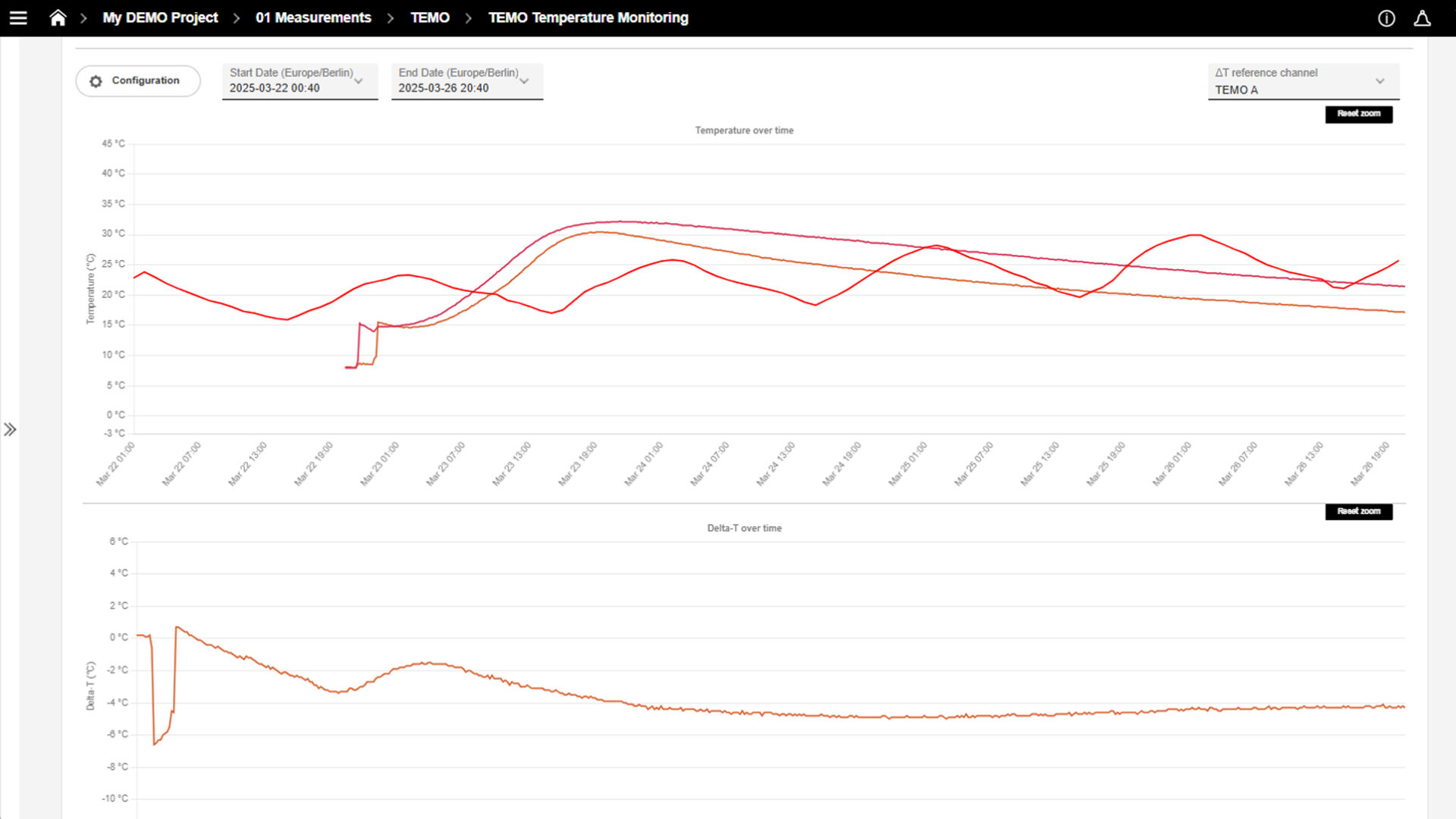 Attēls 2 Vemaventuri tīmekļa lietotnes ekrānuzņēmums ar betona temperatūras līknēm, kas mērītas ar TEMO