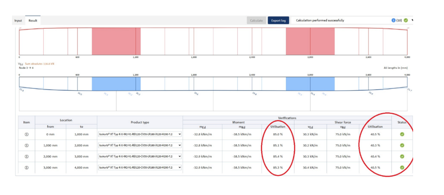 Ja aprēķins tiek atzīts par derīgu, to apstiprina procentuālā noslodze, kam jābūt mazākai par 100 %, un zaļas krāsas punkts, ja ne – iekrāsojas sarkans punkts. Negatīva atbilde gan ir retos gadījumos, un tā nozīmē, ka konstruktīvais risinājums ir jārēķina manuāli.